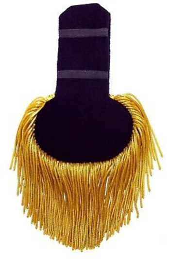 Epaulettes are fastened to the shoulder by a shoulder strap, a small strap parallel to the shoulder seam, and the button near the collar, or by laces on the underside of the epaulette passing through holes in the shoulder of the coat. Colloquially, any shoulder straps with marks are also called epaulettes. The placement of the epaulette, its color and the length and diameter of its bullion fringe are used to signify the wearer’s rank. At the join of the fringe and the shoulder piece is often a metal piece in the form of a crescent. Although originally worn in the field, epaulettes are now normally limited to dress or ceremonial military uniforms..